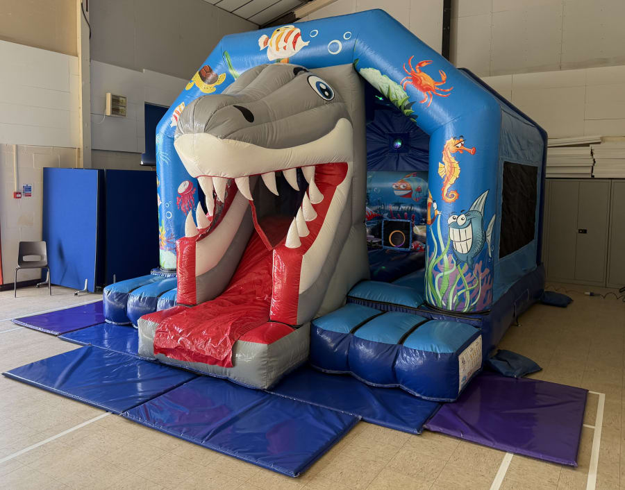 This 3D Shark Bounce & Slide comes with fitted shower cover so perfect for all weather conditions.
