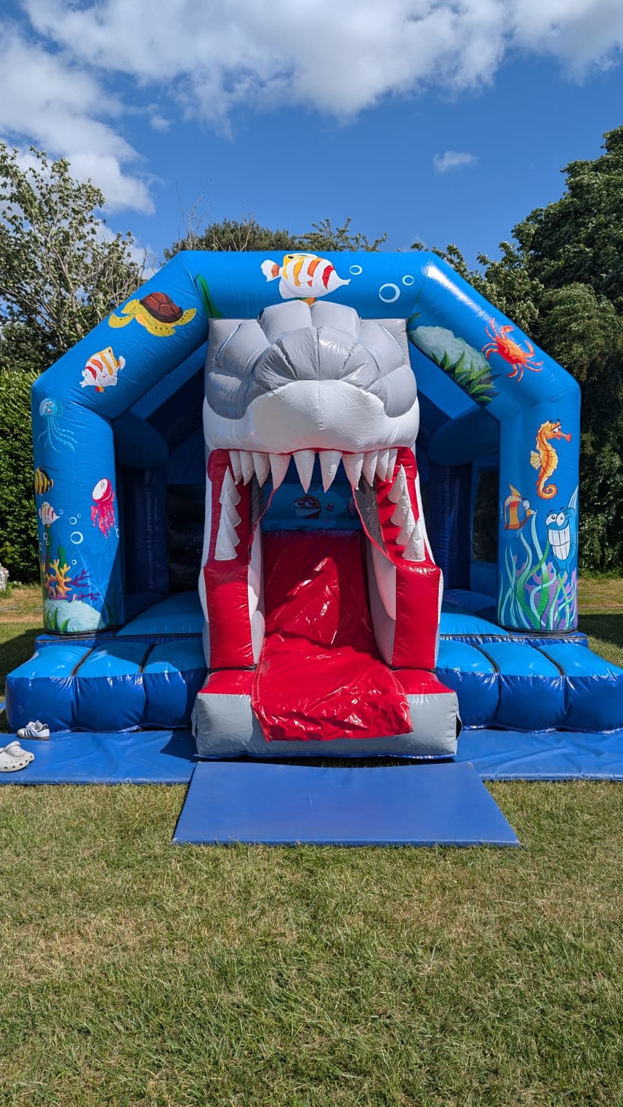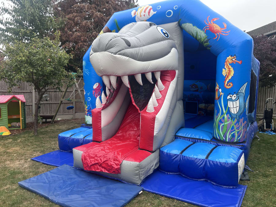 This 3D Shark Bounce & Slide comes with fitted shower cover so perfect for all weather conditions.