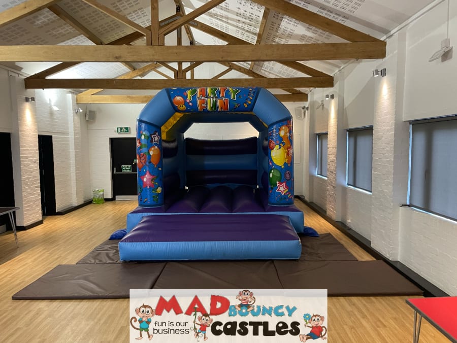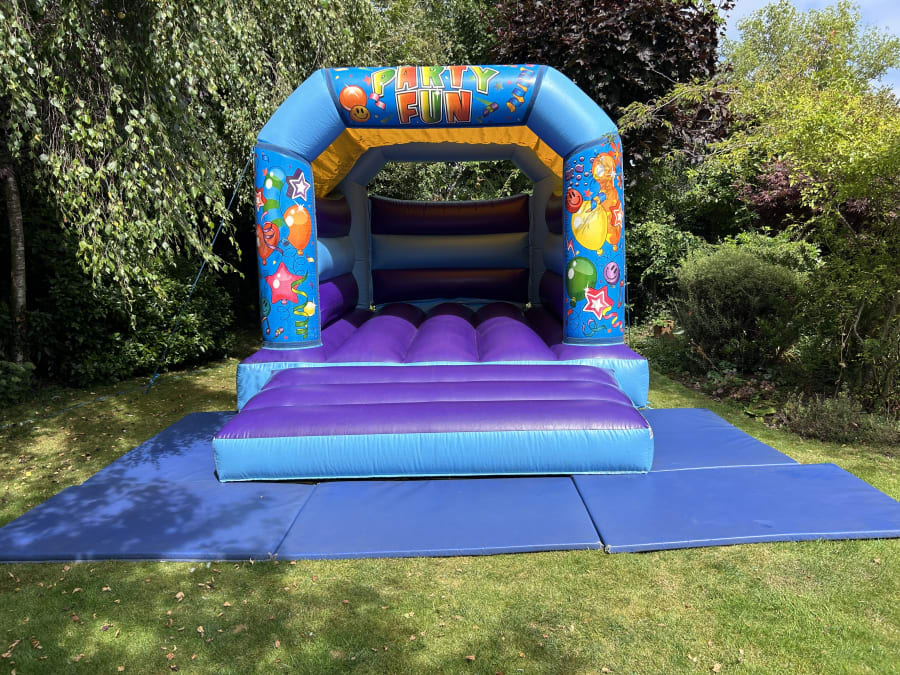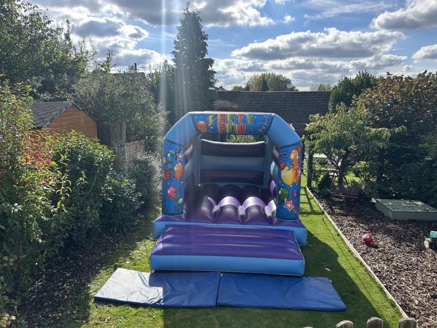 The ideal bouncy castle for all types of events and party’s with it's party theme and size. Excellent style castle as its open so you can watch the kids play! Medium sized blue and purple bouncy castle which will fit in most types of gardens and venues.