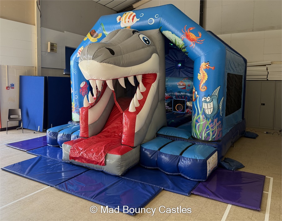 This 3D Shark Bounce & Slide comes with fitted shower cover so perfect for all weather conditions.