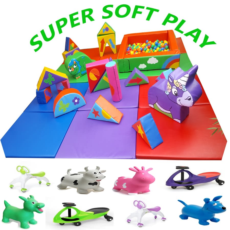 Soft Play - Our super new soft play set is the ideal add on as a package with one of our bouncy castles or bounce slides, toddlers can explore and play in a safe padded area which comes with - soft shapes, ball pond and two sit on toys and happy hopperz.