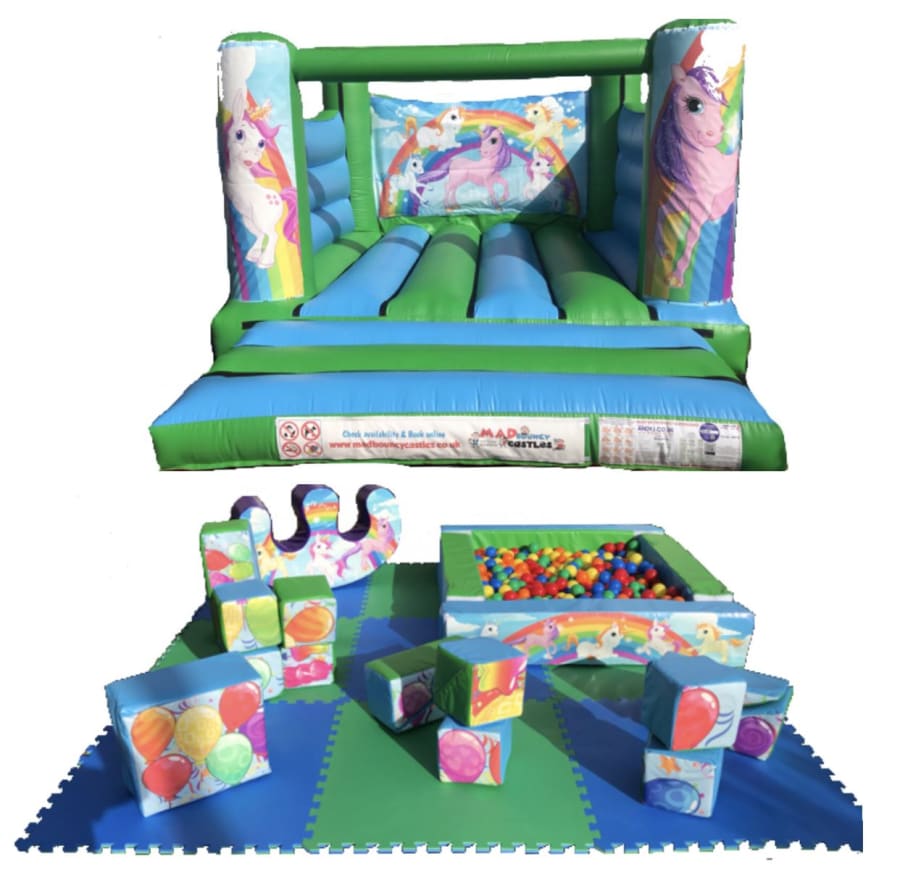 This Package is ideal if you have mixed age range of children attending, the soft play area for toddlers, and then the bouncy castle for the bigger children. The themed unicorn bouncy castle comes with matching ball pond and twin rocker